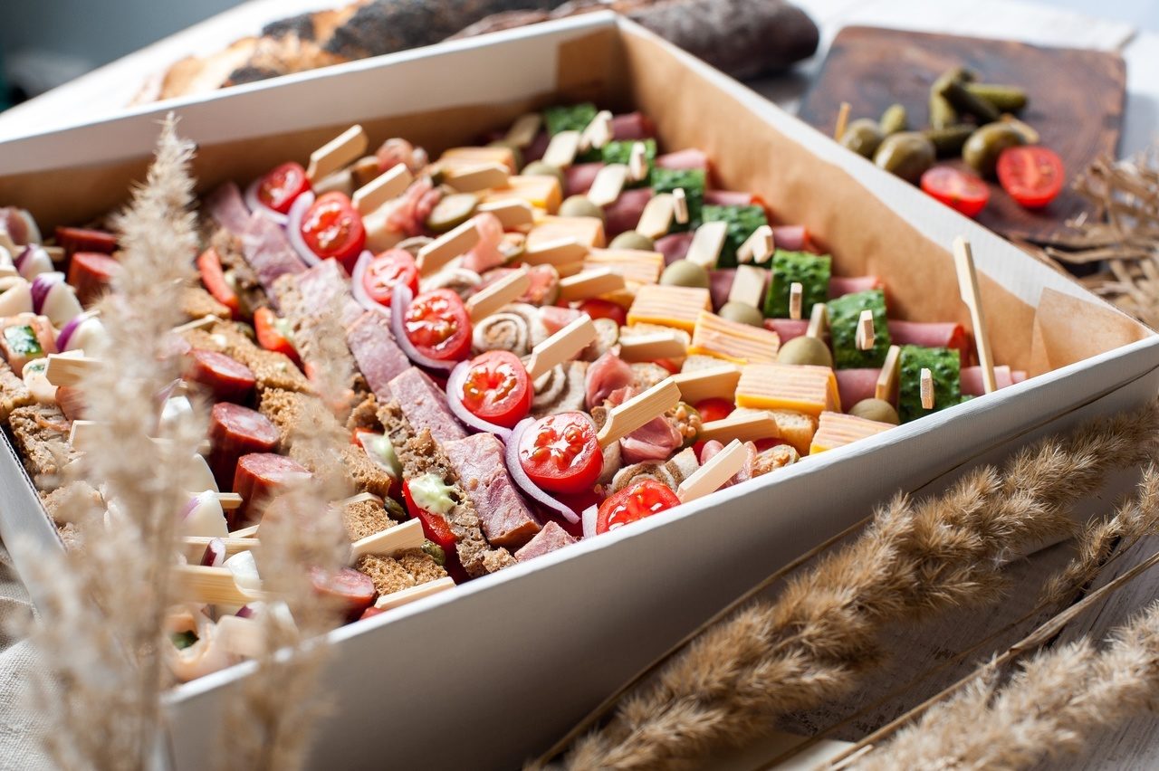 В составе канапе: Копчёная говядина, вяленый томат, огурец. 10шт